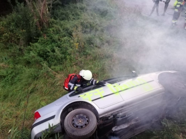 Der PKW blieb auf der Seite im Bachgraben liegen.