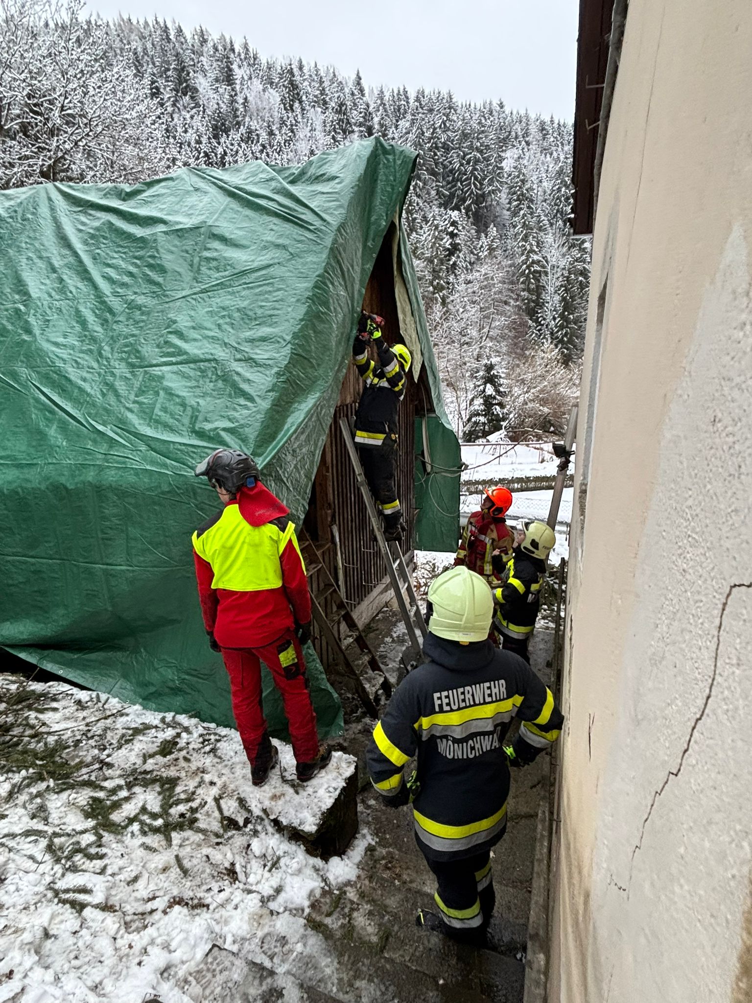 Am Nachmittag brachen dann in Festenburg zwei Bäume unter der Last des Schnees zusammen und stürzten auf ein Wirtschaftsgebäude. Hier standen ebenfalls acht Männer und Frauen der FF Mönichwald mit dem RLF-A 2000 und dem BLF-C im Einsatz. Es galt die Bäume vom Gebäude zu entfernen und das Dacht mit einer Plane abzudecken. Nach gut zwei Stunden konnte gegen 18 Uhr wieder ins Rüsthaus eingerückt werden.